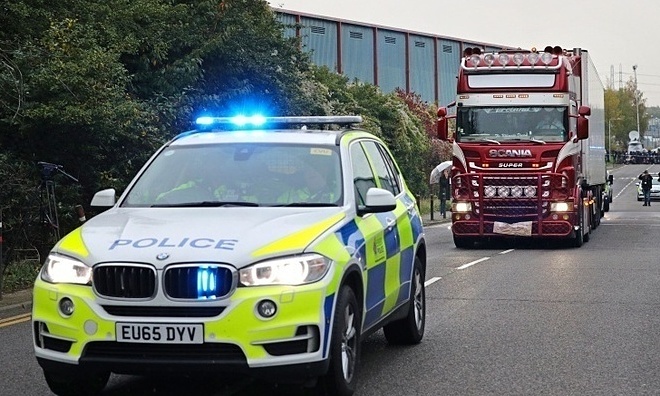 Vào ngày 23 tháng 10, cảnh sát Anh đã hộ tống một xe container, nơi 39 thi thể được tìm thấy ở Essex. Ảnh: Reuters-Tại cảng Zeebrugge (Anh), bên trong container không có tín hiệu điện thoại. Tuy nhiên, đoạn ghi âm được tìm thấy trong 50 cuộc điện thoại mà cảnh sát thu thập được để chia tay người thân.