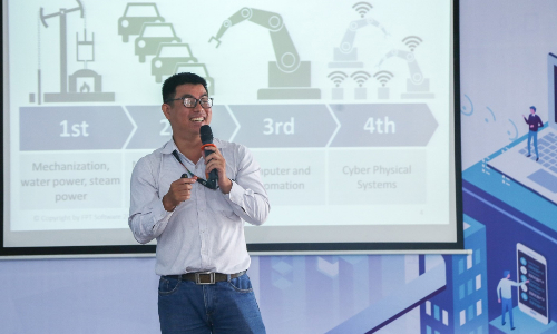 Khi gặp gỡ sinh viên Đại học Honghu (Đồng Nai) trong khuôn khổ xTour “Tuổi trẻ 4.0”, giáo sư nội bộ FPT Software kiêm quản lý dự án Đinh Vũ Quốc Trung cho biết: “Cách mạng công nghiệp lần thứ hai tạo ra điện vì con người có thể làm việc cả ngày lẫn đêm. Từ đó nâng cao năng suất lao động Trong cuộc cách mạng công nghiệp lần thứ tư, robot sẽ thay thế con người và khiến con người phải làm việc không ngừng nghỉ, ông cũng tin rằng “nhà máy thông minh” sẽ trở thành sản phẩm tiêu biểu trong thời đại công nghệ. Vũ Trung Quốc chia sẻ Cách mạng công nghiệp 4.0 .