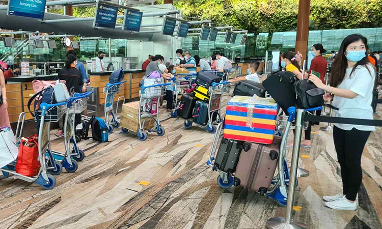 Hành khách chờ lên máy bay trên chuyến bay trở về từ Singapore vào ngày 7 tháng 8. Ảnh: Bộ Ngoại giao Sau khi máy bay hạ cánh, hành khách được theo dõi và cách ly y tế tập trung.
