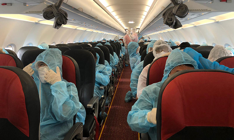 Vào ngày 2 tháng 8, hành khách và phi hành đoàn mặc quần áo bảo hộ và mặt nạ đã bay đến hơn 230 công dân Thái Lan. Ảnh: Bộ Ngoại giao -Từ ngày 10/4 đến nay, Việt Nam đã tổ chức hơn 60 chuyến bay khứ hồi, đưa hơn 16.000 công dân đến hơn 50 quốc gia và vùng lãnh thổ trong nước tránh dịch bệnh này bệnh. Việt Nam tiếp tục xây dựng kế hoạch đưa công dân về nước để đáp ứng nhu cầu ở nước ngoài của người Việt Nam và phù hợp với tình trạng cô lập trong nước.